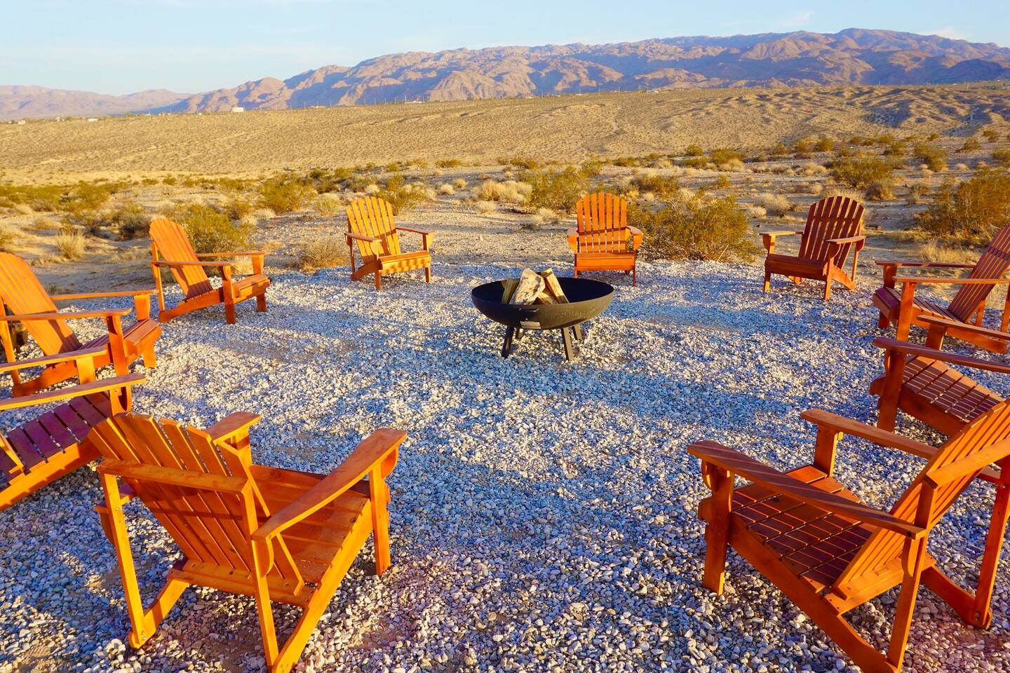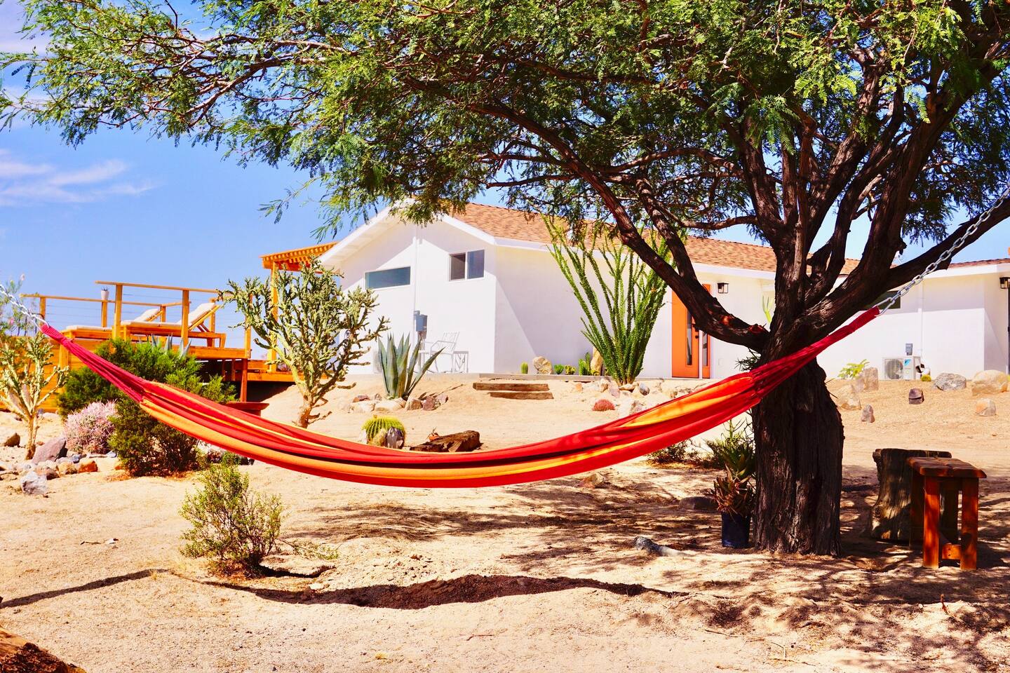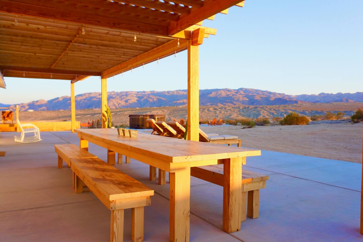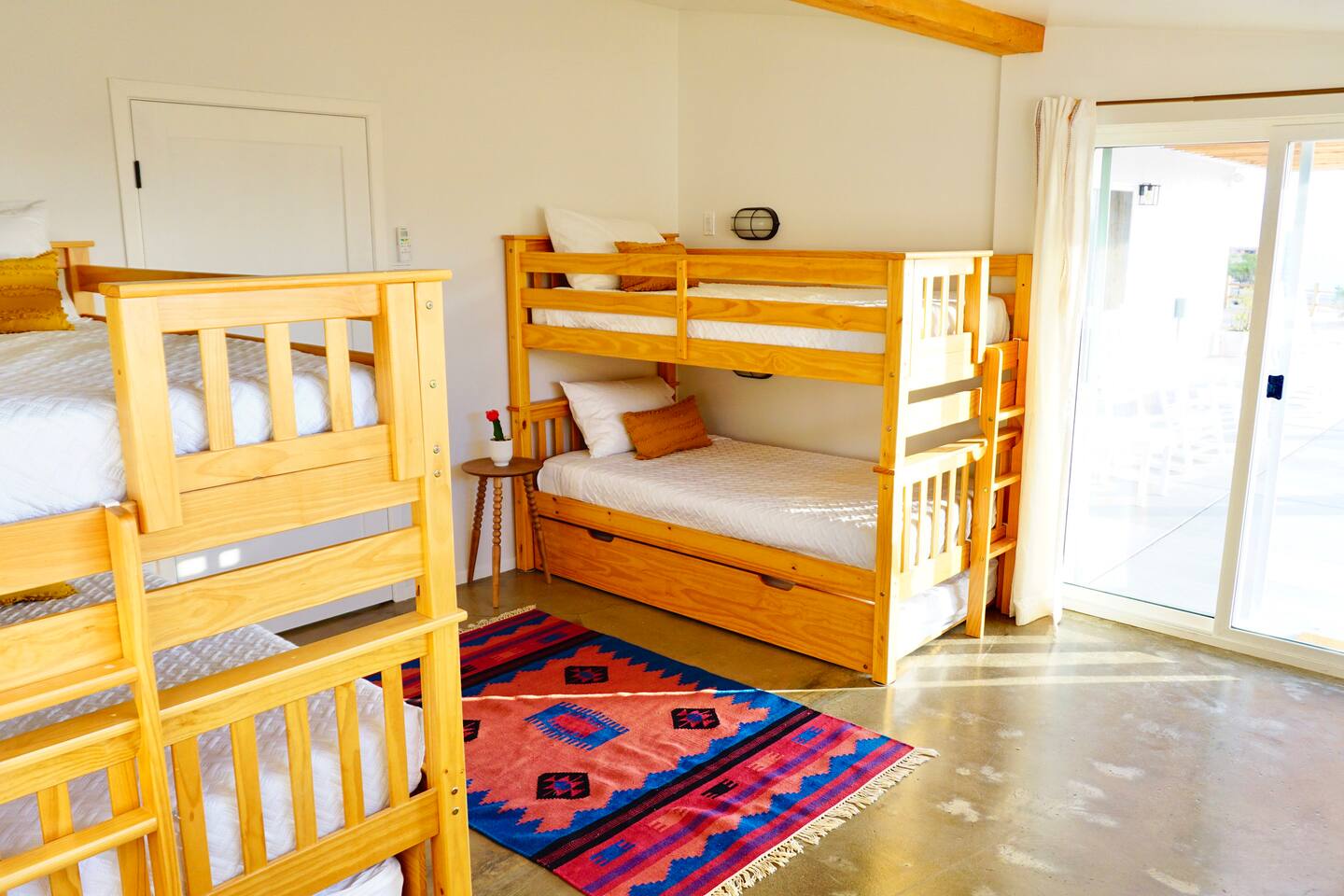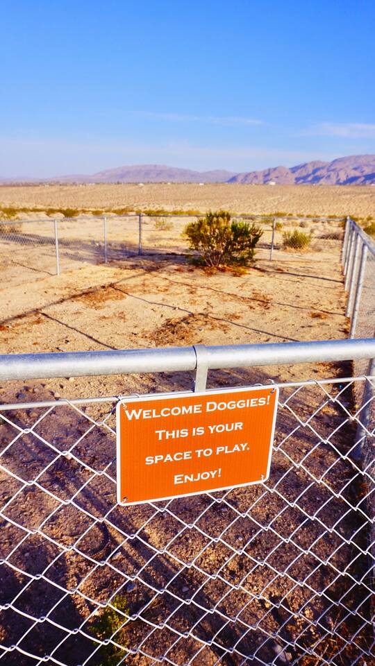 ☆ Spectacular views and privacy ☆ Hot tub ☆ Swimming pool ☆ Fire pit ☆ Propane BBQ/Fully equipped kitchen ☆ Hammocks/lounge chairs/rocking chairs ☆ Two large covered patios w/ outdoor dining ☆ Heating/AC ☆ EV charging station ☆ Walk-in closet that doubles as a nursery for nap time :) ☆ Dog run ☆ Horseshoes, cornhole, giant Jenga and more! ☆ Games, record player and library Bedroom 1 - King bed with en suite bathroom and futon/pull-out. This huge bedroom also has a walk in closet that doubles as a nursery! When our kiddos were babies, we always wanted a dark space to put them down for naps. Pack and play, baby monitor and high chairs available. Bedroom 2 - King bed Bedroom 3 - Two bunk beds with trundles (sleeps 6, if needs be) Bedroom 4 - King bed with en suite bathroom. Plus two cots that can be utilized anywhere in the house that suits your group. ► 15 minutes to Joshua Tree National Park Visitor's Center (called Oasis Center at the North Entrance to the park) ► 10 minutes to downtown Twentynine Palms (great bars, restaurants, grocery stores, shops, galleries etc)
