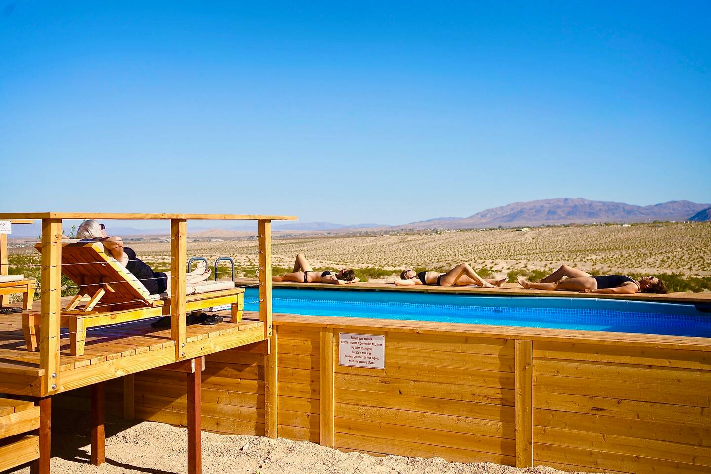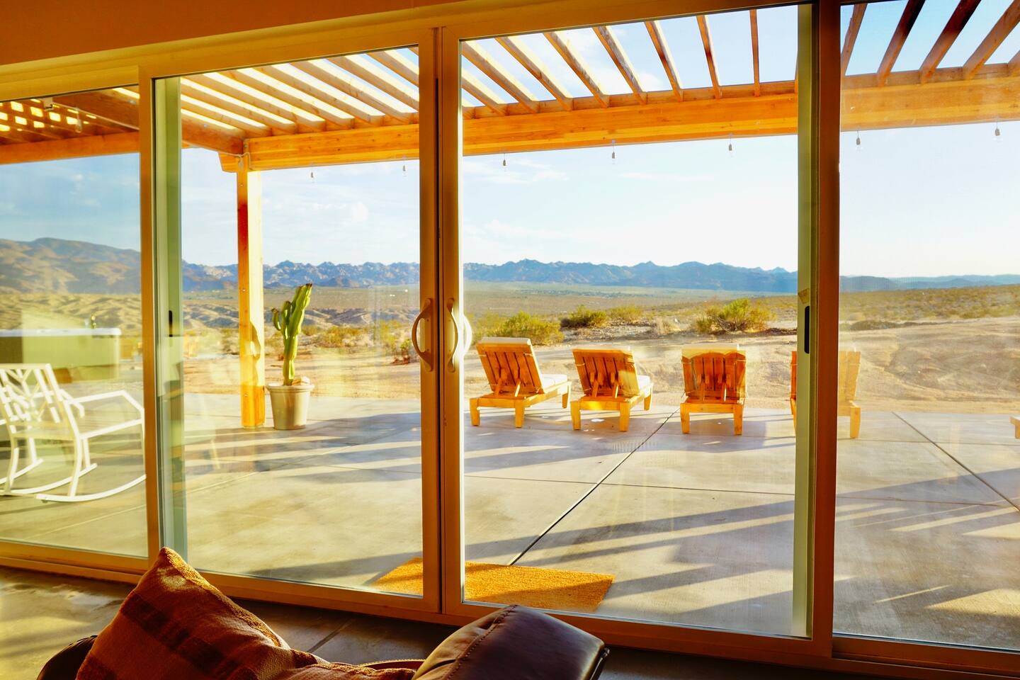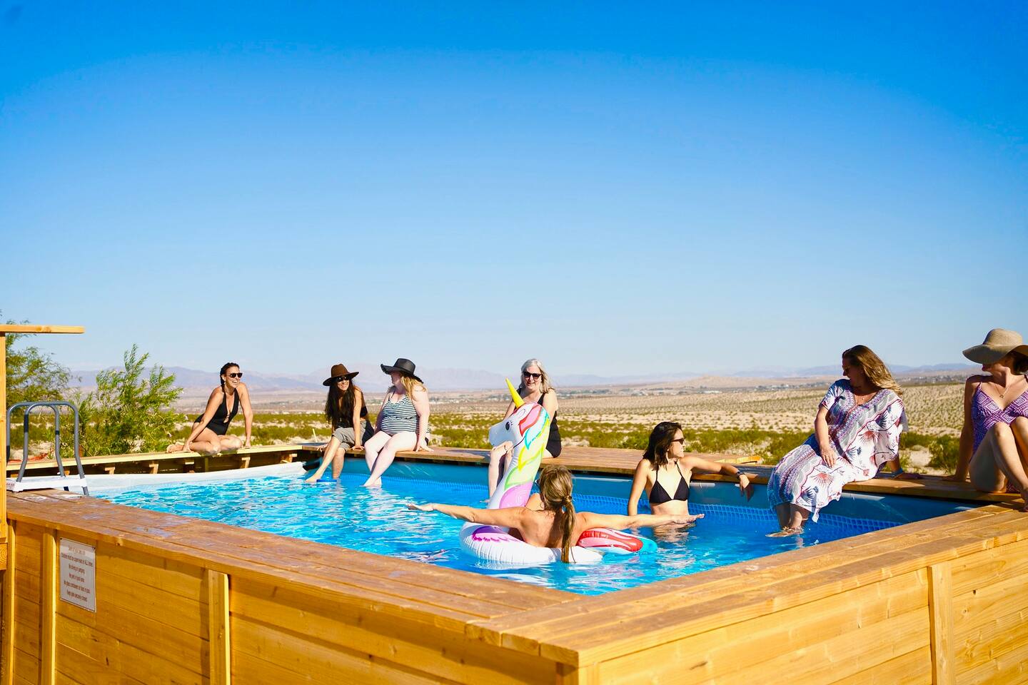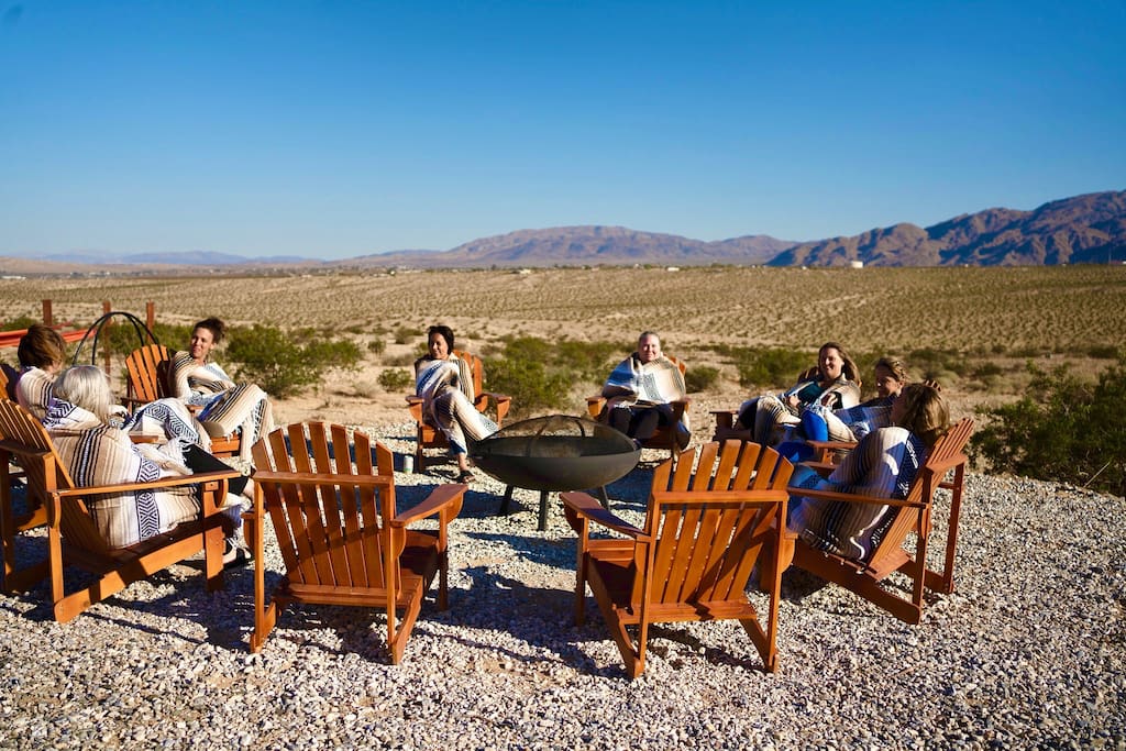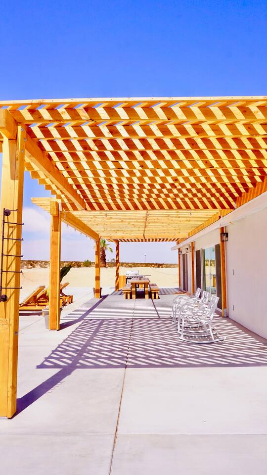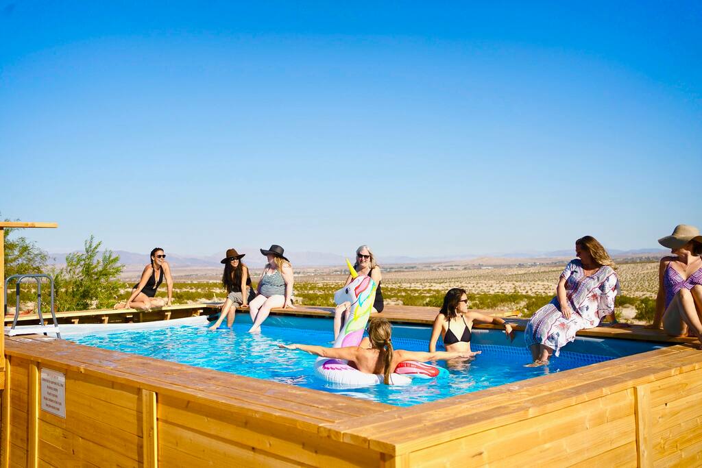 ☆ Spectacular views and privacy ☆ Hot tub ☆ Swimming pool ☆ Fire pit ☆ Propane BBQ/Fully equipped kitchen ☆ Hammocks/lounge chairs/rocking chairs ☆ Two large covered patios w/ outdoor dining ☆ Heating/AC ☆ EV charging station ☆ Walk-in closet that doubles as a nursery for nap time :) ☆ Dog run ☆ Horseshoes, cornhole, giant Jenga and more! ☆ Games, record player and library Bedroom 1 - King bed with en suite bathroom and futon/pull-out. This huge bedroom also has a walk in closet that doubles as a nursery! When our kiddos were babies, we always wanted a dark space to put them down for naps. Pack and play, baby monitor and high chairs available. Bedroom 2 - King bed Bedroom 3 - Two bunk beds with trundles (sleeps 6, if needs be) Bedroom 4 - King bed with en suite bathroom. Plus two cots that can be utilized anywhere in the house that suits your group. ► 15 minutes to Joshua Tree National Park Visitor's Center (called Oasis Center at the North Entrance to the park) ► 10 minutes to downtown Twentynine Palms (great bars, restaurants, grocery stores, shops, galleries etc)