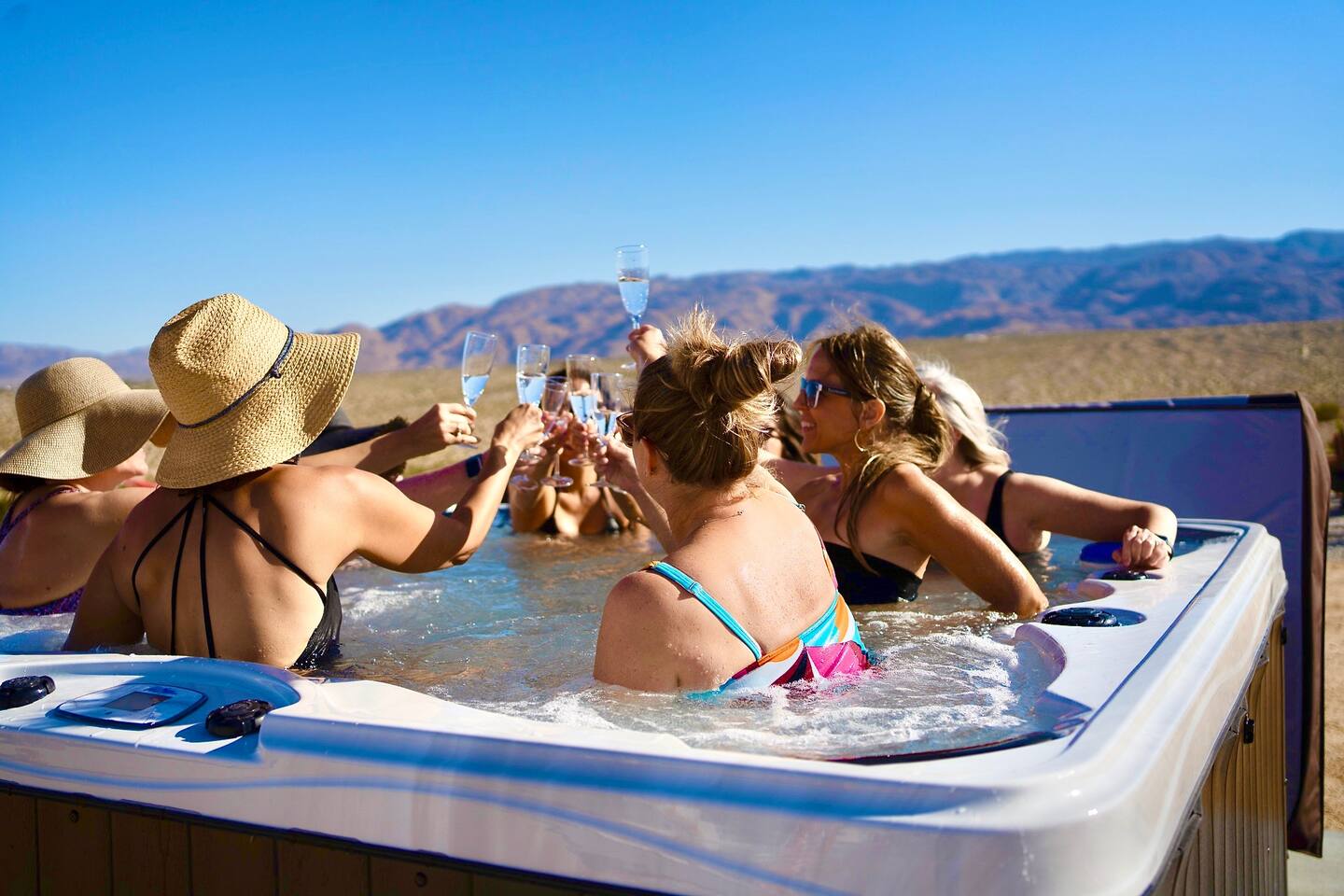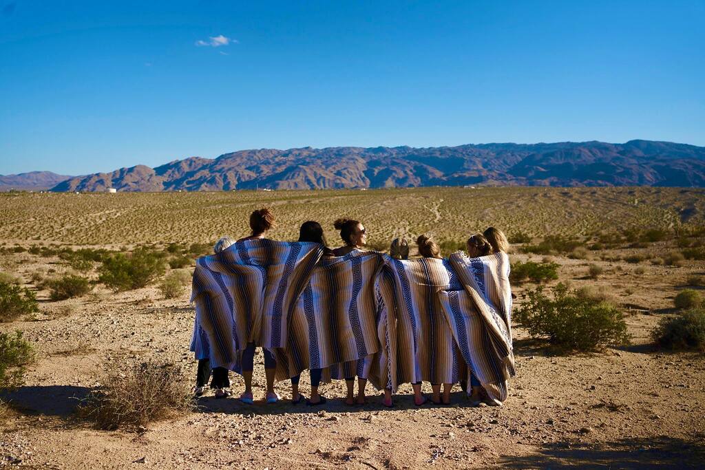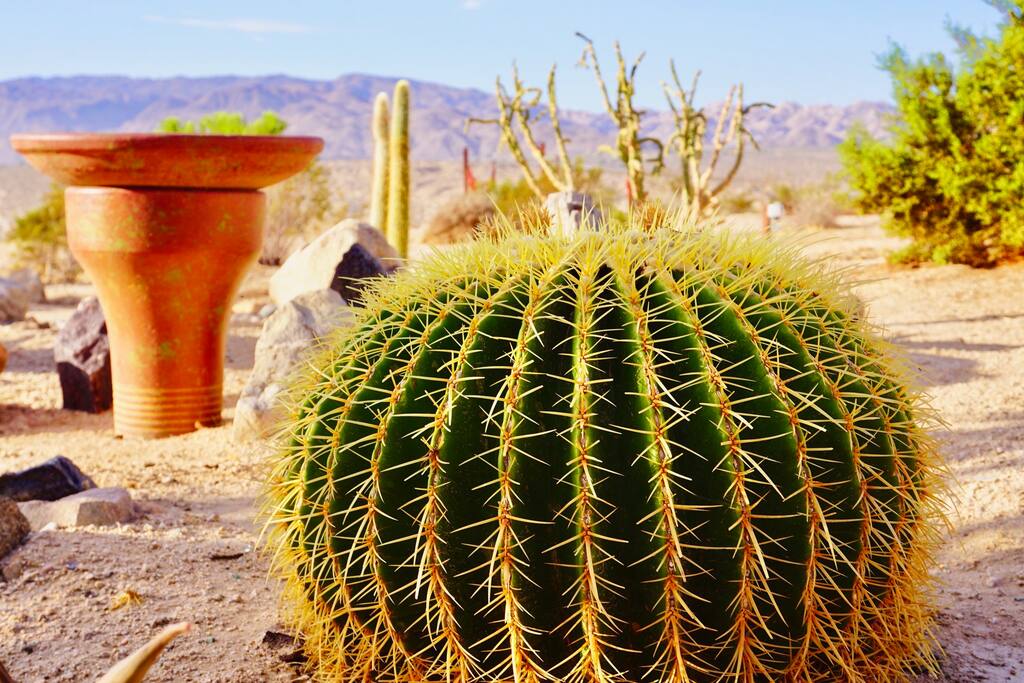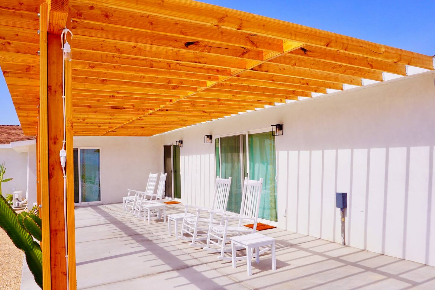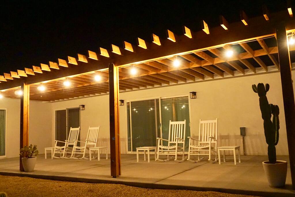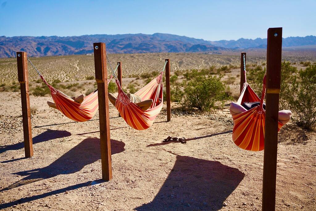 ☆ Spectacular views and privacy ☆ Hot tub ☆ Swimming pool ☆ Fire pit ☆ Propane BBQ/Fully equipped kitchen ☆ Hammocks/lounge chairs/rocking chairs ☆ Two large covered patios w/ outdoor dining ☆ Heating/AC ☆ EV charging station ☆ Walk-in closet that doubles as a nursery for nap time :) ☆ Dog run ☆ Horseshoes, cornhole, giant Jenga and more! ☆ Games, record player and library Bedroom 1 - King bed with en suite bathroom and futon/pull-out. This huge bedroom also has a walk in closet that doubles as a nursery! When our kiddos were babies, we always wanted a dark space to put them down for naps. Pack and play, baby monitor and high chairs available. Bedroom 2 - King bed Bedroom 3 - Two bunk beds with trundles (sleeps 6, if needs be) Bedroom 4 - King bed with en suite bathroom. Plus two cots that can be utilized anywhere in the house that suits your group. ► 15 minutes to Joshua Tree National Park Visitor's Center (called Oasis Center at the North Entrance to the park) ► 10 minutes to downtown Twentynine Palms (great bars, restaurants, grocery stores, shops, galleries etc)