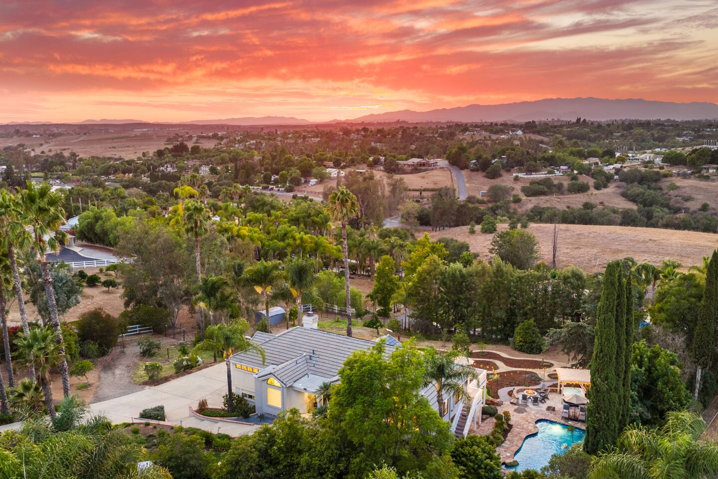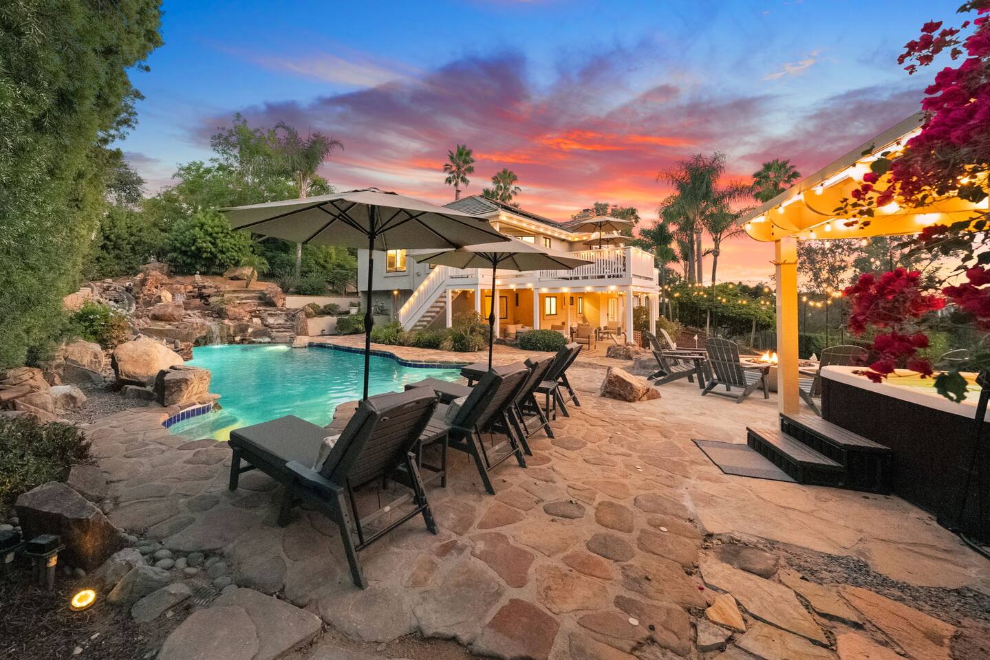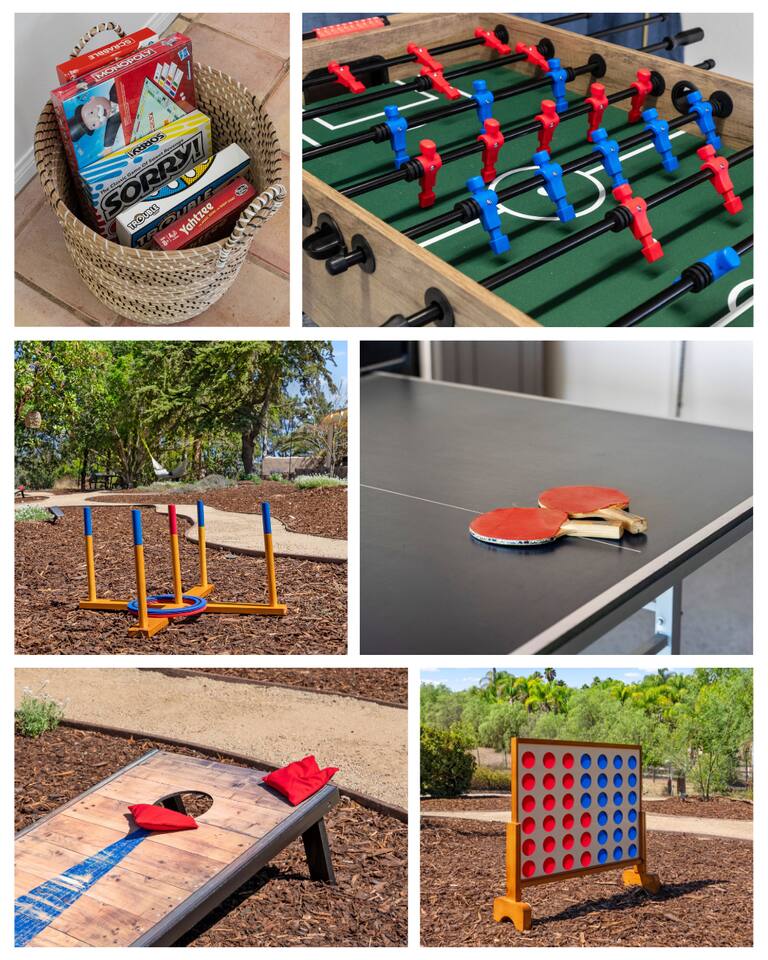 ★NEW LISTING!★ Sunset Ridge Retreat is your own private wine country, luxury getaway! Perfect retreat for a girls trip, bachelorettes, families, friends & couples for the ultimate resort like atmosphere. ★THE LOCATION★ Just minutes from the charming Main St of Fallbrook and the award-winning wineries of both Fallbrook and Temecula, you’ll be at the center of Southern California’s finest offerings. Spend the day wine tasting, golfing, hiking, horseback riding or hot air ballooning—or take a quick drive to San Diego’s 75 miles of coastline, world-famous zoo, or theme parks. Whether you crave adventure or serenity, Sunset Ridge is the perfect base. Centrally located close to the 15 Freeway and the 76 Freeway. Nearby Highlights: Fallbrook Winery - 1.5 miles away (walkable!) Monserate Winery - 5.2 miles away Los Willows - 7.7 miles away Grand Tradition Estates - 3.8 miles away Temecula - 14 miles away Oceanside - 18.3 miles away Pechanga Casino - 15.8 miles Pala Casino - 13 mile Legoland – 21.8 miles San Diego Zoo – 52 miles Wild Animal Safari Park - 33 miles Disneyland – 80.2 miles ★THE PROPERTY★ Sunset Ridge is exclusively yours! Very private and surrounded by stunning mountain and vineyard views. Lounge by the pool, sip a glass of wine in the hot tub or by the firepit, float in the hammock with a book while watching the sun descend behind the mountains. Please note: This is not a party house. We strictly enforce the local noise ordinance and work hard to maintain the chill vibe of the surrounding area. ★ Home Highlights ☆Gorgeous Swimming Pool with Multiple Waterfalls ☆Heated Hot Tub (at 101 on demand) ☆Game Room with Smart TV ☆Mini Putt area ☆Foos Ball ☆Hammock ☆Ping Pong table ☆Rowing Machine ☆Firepit ☆Meditation Paths ☆Yoga Mats ☆Multiple Outdoor Seating/Lounging Areas ☆Art area for painting and drawing ☆Cornhole ☆Board games, puzzles and children toys ☆Giant Connect Four and Jenga ☆Free weights ☆Poolside seating ☆Outdoor dining table ☆ Coffee bar (coffee, creamer, sugar provided) ☆Private desk space ☆ High speed internet ☆Chef's Kitchen (fully equipped!) ☆Epic views ☆Picnic bench/area ☆4 Comfortable and carefully designed bedrooms which boast 5 star comforts (black out shades, sound machines, charging stations) ☆ 2 full bathrooms and one half bath ☆Multiple Living Rooms/Outdoor Lounge Areas ☆Newly Renovated with Designer Decor and Furniture ☆BBQ (w propane provided) ☆Huge Outdoor Deck and Lower Patio ☆ High-Speed Wi-Fi ☆Free Parking (ample parking for large groups) ☆Multiple seating areas (benches, hammocks, tables, chairs and lounge chairs) have been strategically placed for taking in the views ★ SLEEPING ARRANGEMENTS – 4 BEDROOMS/ Sleeps 10 - Sleeps 12 (if requested, with additional fees) ★ ☆ BEDROOM #1 - 1 King Bed (plus Queen sofa bed and two additional twin foam rollaway beds to be located wherever you desire - linens for extra beds in closet) ☆ BEDROOM #2 - 1 Queen Bed ☆ BEDROOM #3 - King Bed ☆ BEDROOM #4 - 1 King Bed (plus full size futon bed - linens in closet) ★ BATHROOMS ★ All bathrooms are stocked with towels (face, body, hand) and essential toiletries to ensure a carefree stay. There is one full bathroom upstairs for Bedrooms #1 & 2 and another 1/2 bath upstairs. Downstairs there is another full bathroom to be shared between Bedrooms #3 & 4. ★ KITCHEN & DINING ★ Chef’s kitchen with plenty of counter space and appliances to cook a gourmet meal ★ 2 LARGE LIVING ROOM SPACES ★ You will feel right at home! Take a moment to unwind, marvel at the amazing views from your choice of comfy sofa! ☆2 Living Rooms (one with Large Smart TV) ☆Throw Blankets ☆ Games and puzzles ☆Access to the Deck ★Outdoor Dining★ Ready to dine and wine with your loved ones or friends while the steak or burgers are on the grill! ☆Dining Table and Dining Bar ☆Propane BBQ (we supply the first tank!) ☆Outdoor Dining Plates and Glasses ★ GAME ROOM/GYM★ Ready for the excitement and challenge- come down to the game room/gym to play or get your sweat on! ☆Ping Pong Table ☆Foos Ball ☆Corn Hole ☆Large Smart TV to watch games ☆Jumbo Connect 4 ☆Jumbo Jenga ☆Rowing Machine ☆Exercise Bike ☆Yoga Mats ☆Weights ★ Pool - Pool can be heated to 80 degrees for an additional fee ($200/day - including 24 hours prior to arrival) Pool safety fence can be erected for $75 fee with 72 hours notice. ★ Private ☆Excellent neighborhood for walking and many hiking trails throughout the area. ★ Kid Essentials- Ready to unwind while kiddos are entertaining themselves. ☆Games & Books ☆Play and Travel Crib ☆Baby Dining Chair ☆Dining Plates/Utensils Other than the already mentioned amenities, our home also comes with the following: ☆Air Conditioning & Heating ☆Laundry Room (Washer/Dryer, Iron/Board, Detergent) ★ Ready to book★ Grab your dates now (before someone else does). Please let us know if you have any questions regarding Sunset Ridge. We are happy to help! Thanks for visiting and happy travels!