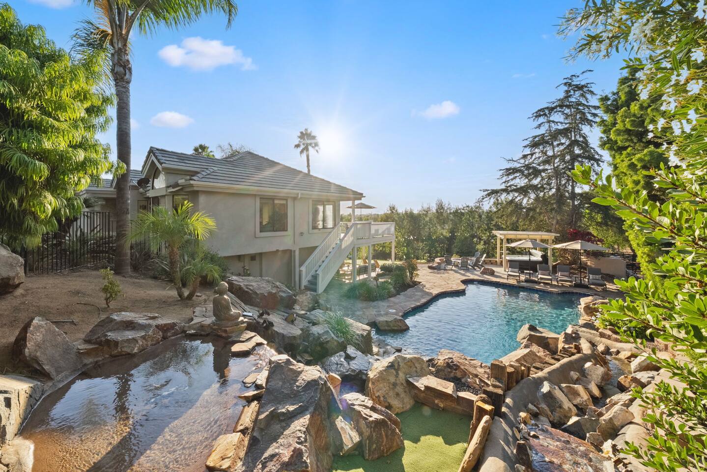 ★Welcome to your private slice of Southern California paradise! This newly renovated, family-friendly home has it all - a sparkling pool, relaxing spa, mini-putt course, fire pit, hammock, games room, and jaw-dropping views. Minutes to local wineries and wedding venues, downtown Fallbrook and the 76 & 15 freeways. Close to Temecula and the beaches! Huge outdoor living space & endless fun for all ages. Perfect for wine lovers, families & groups seeking relaxation and adventure in sunny So Cal!★